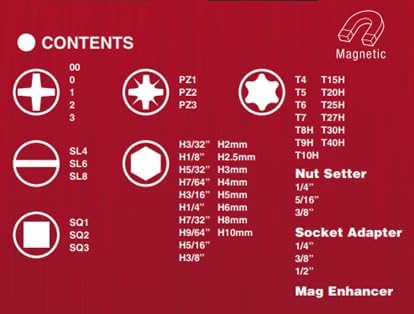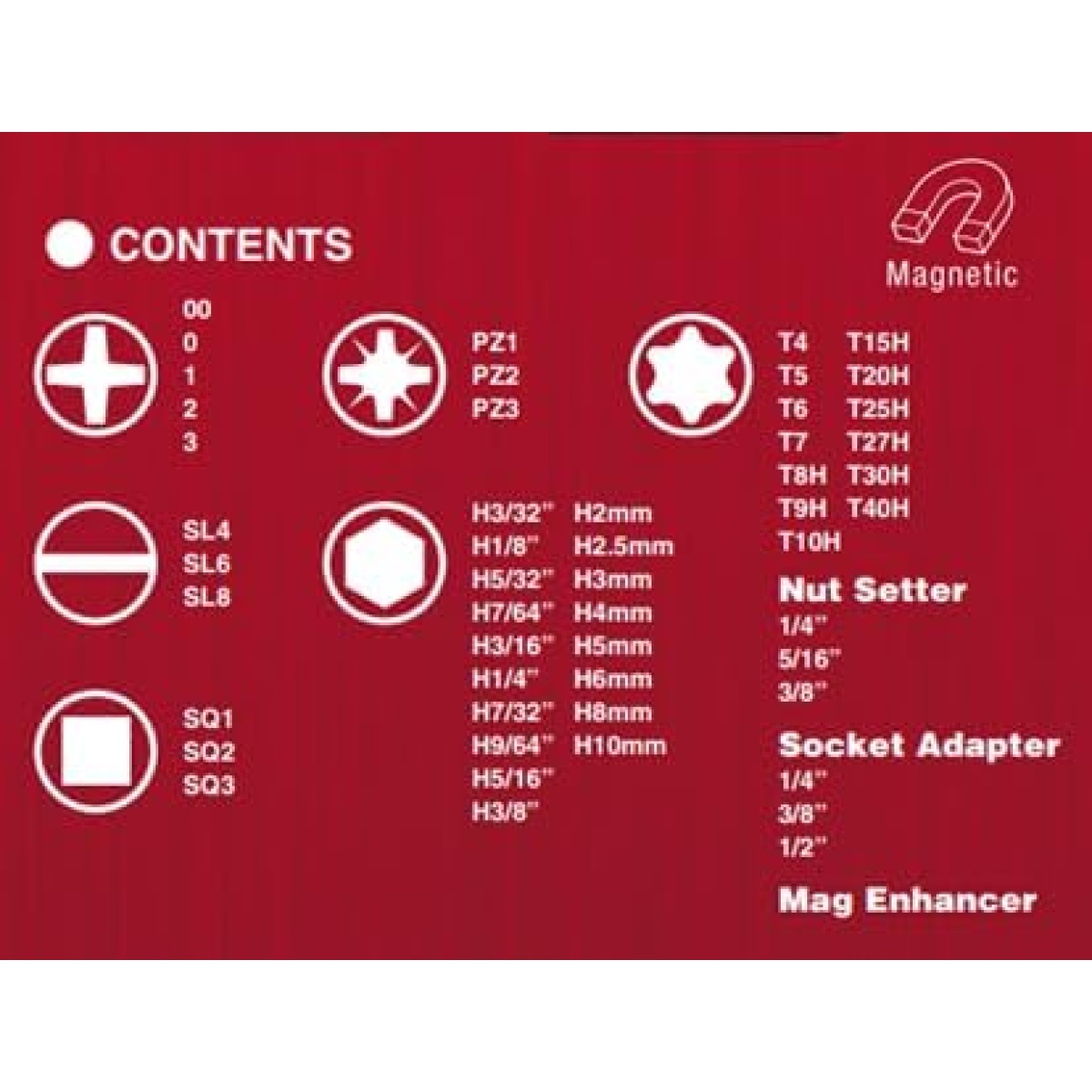Including +00, +0, +1, +2, +3, SL4, SL6, SL8, SQ1, SQ2, SQ3, PZ1, PZ2, PZ3, T4, T5, T6, T7, T8H, T9H, T10H, T15H, T20H, T25H, T27H, T30H, T40H, H2, H2.5, H3, H4, H5, H6, H8, H10, H3/32″, H1/8″, H5/32″, H7/64″, H3/16″, H1/4″,H7/32″, H9/64″, H5/16″, H3/8″, Nut Setter 1/4″, 5/16″, 3/8″, Socket Adapter 1/4″, 3/8″, 1/2″, 1pc Mag Enhancer