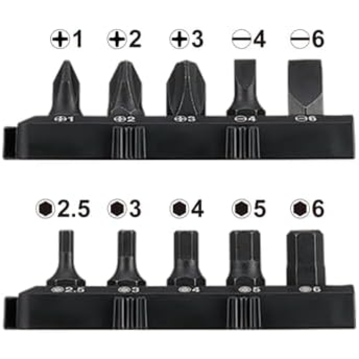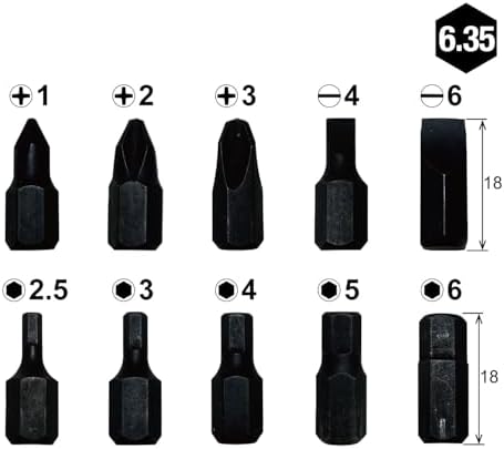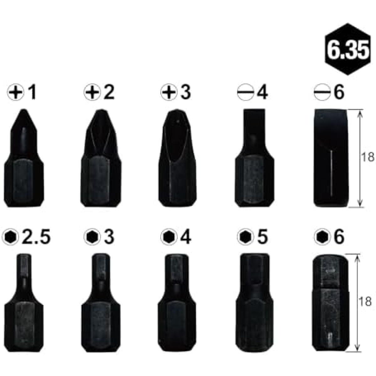 Set Includes: Main unit (straight), bit + 1, +2, +3, -4, -6, H2.5, H3, H4, H5, H6 x 18 mm (1 each), holder x 2